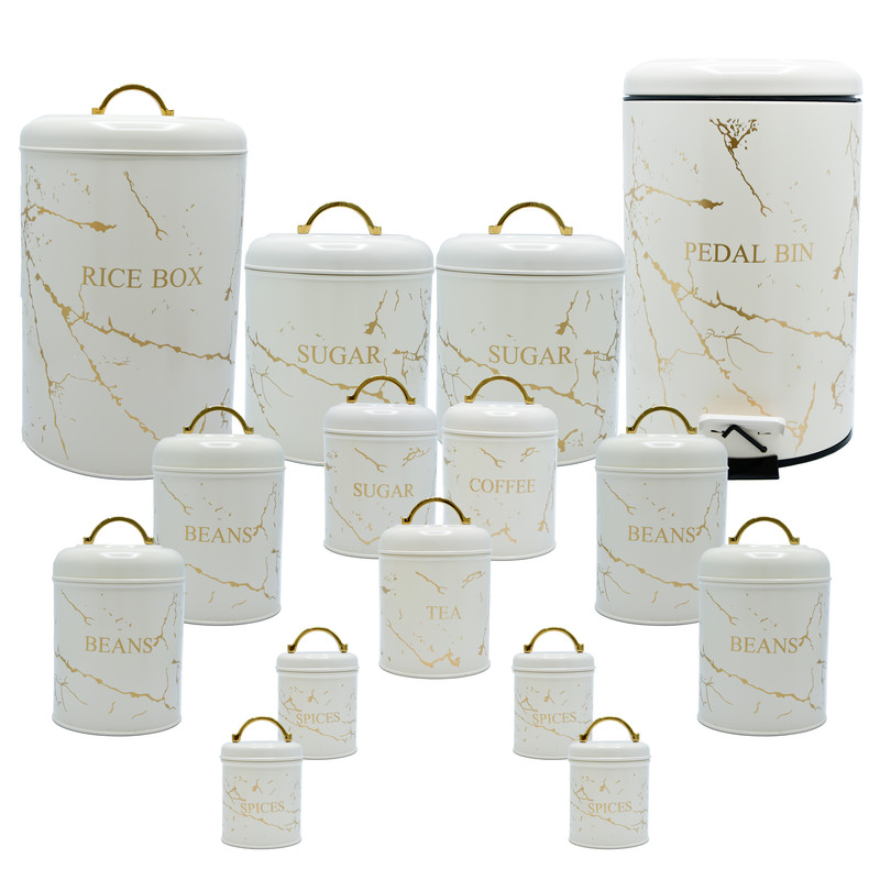 سرویس آشپزخانه 16 پارچه بی وی کی شامل جابرنجی، سطل زباله، ظرف قند و شکر، جاحبوباتی و جا ادویه است.طراحی و ساخت این محصول به گونهای بوده که عنوان هر ماده روی بدنهی ظرف درج شده و شما به آسانی بدون اینکه درپوش ظرف را برداشته بتوانید محتویات داخل آن را شناسایی کنید. هر کدام از این ظروف دارای درپوش و دسته بوده و وجود دسته باعث شده که به راحتی بتوانید آن را جابهجا کنید. درب های به کار رفته در این ظرف بسیار محکم و مقاوم بوده و محتویات داخل آن را به خوبی نگهداری میکند. درپوش موجود روی این ظروف از جنس بدنه می باشد. سطل برنج :1 عدد سطل قند :1 عدد سطل شکر :1 عدد ظروف حبوبات : 4 عدد ظروف ادویه :4 عدد ظروف پاسماوری : 3 عدد سطل زباله :1 عدد به همراه یک استند