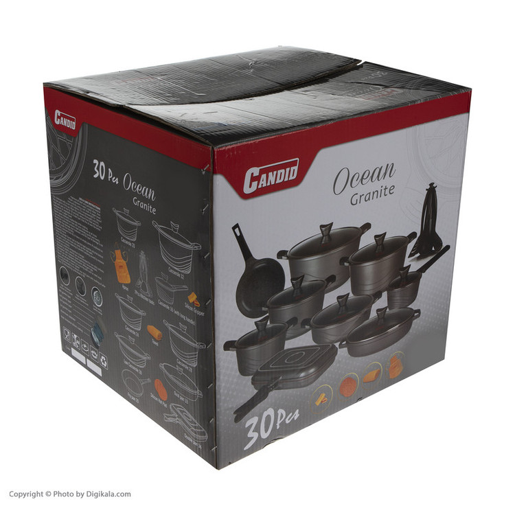سرویس پخت و پز 30 پارچه کاندید مدل OCEAN با داشتن تنوع در سایز قابلمه و تابه، یکی از کاربردیترین لوازمی است که در هر آشپزخانه به آن نیاز است. در صورت داشتن تعداد زیادی مهمان یا برای خانوادههایی پرجمعیت، یک سرویس پخت با تنوع در سایز قابلمه از ضروریات است. روکش این کالا گرانیتی است؛ به همین دلیل از نچسببودن و شستوشوی آنها خیالتان آسوده خواهد بود. در این سرویس پختوپز توزیع حرارت در ظروف کاملا یکنواخت بوده و از ضخامت مطلوبی برخوردار است این محصول با 4 قابلمه در سایزهای 32 ، 28، 24و 20 و با داشتن 5 تابه با سایز در ابعاد گوناگون در مقایسه با سایر سرویس قابلمهها بسیار کامل است. در کنار این اقلام در بسته این کالا 3 عدد کفگیر یک قاشق آشپزی، یک عدد کفگیر اسپاگتی، 2 زیر قابلمهای، 1 عدد دستمال و یک عدد پیشبند وجود دارد.