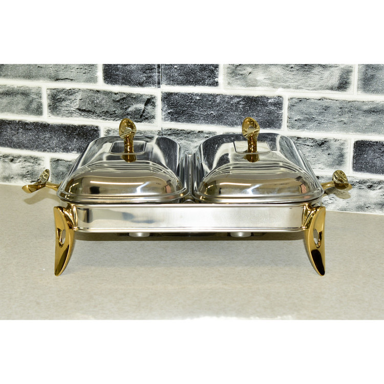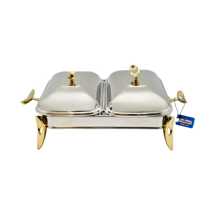 سوفلهخوری قایقی طلایی دوقلو یونیک ساخته شده از دو قسمت مجزا است. ظرف پیرکس فرانسه داخلی برای قرار دادن غذا و بدنه و درب از جنس استیل ضد زنگ درجه یک میباشد. این محصول مناسب برای سرو انواع غذا به صورت سرد و گرم است. زیر این ظرف دو جا شمعی تعبیه شده و گرمای کافی برای گرم نگه داشتن انواع غذاها را تامین میکند.