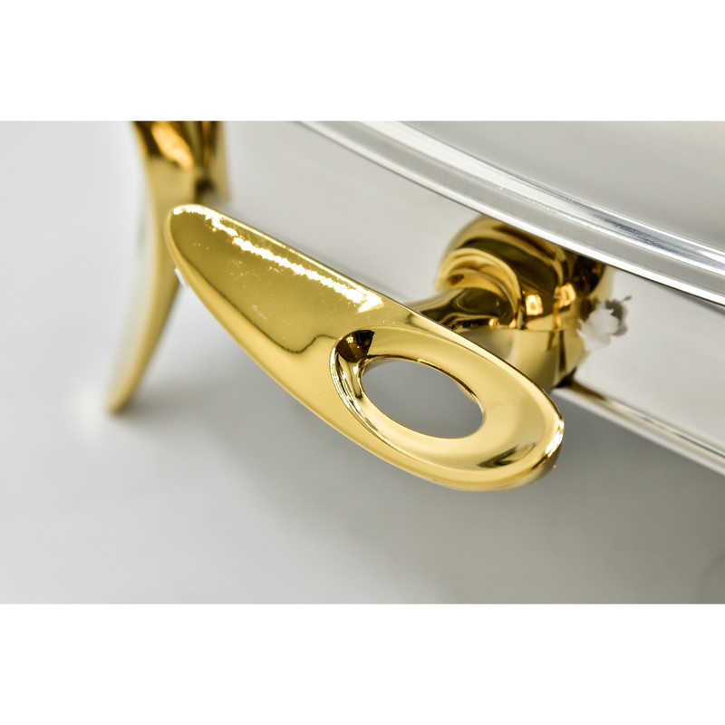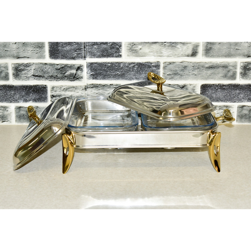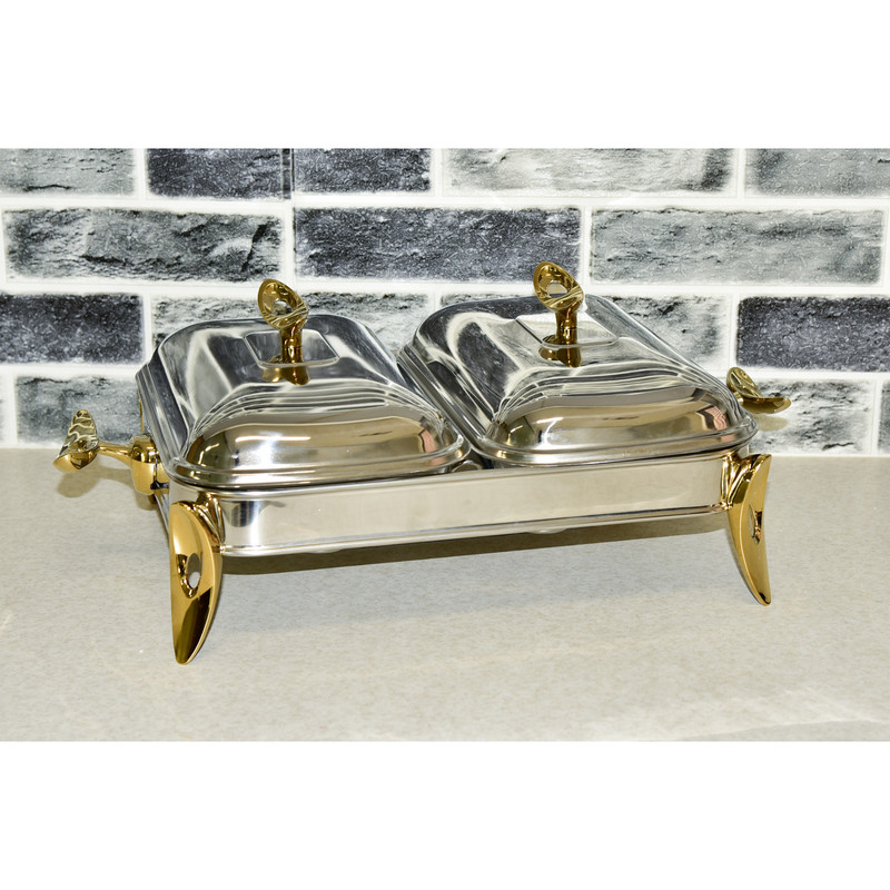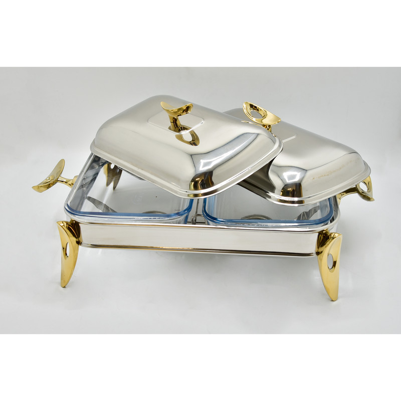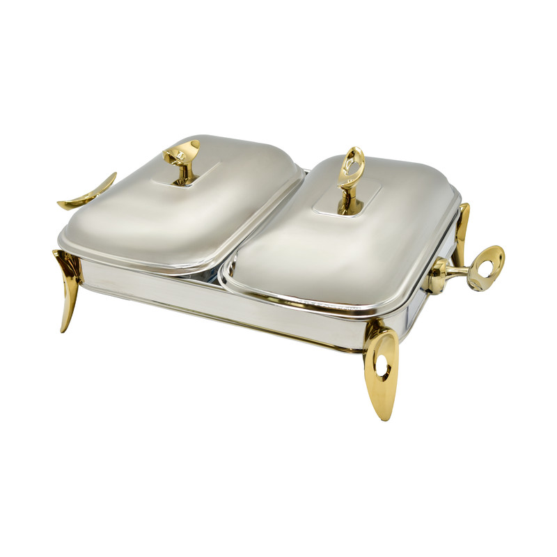 سوفلهخوری قایقی طلایی دوقلو یونیک ساخته شده از دو قسمت مجزا است. ظرف پیرکس فرانسه داخلی برای قرار دادن غذا و بدنه و درب از جنس استیل ضد زنگ درجه یک میباشد. این محصول مناسب برای سرو انواع غذا به صورت سرد و گرم است. زیر این ظرف دو جا شمعی تعبیه شده و گرمای کافی برای گرم نگه داشتن انواع غذاها را تامین میکند.