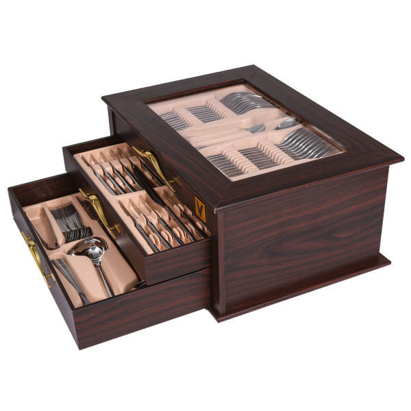 این سرویس 30 نفره 151پارچه بوده و در واقع یک سرویس کامل بسیار لوکس در دو رنگ نیمه طلایی و نیمه مات مشتمل بر اقلام کاملا کاربردی بوده که از استیل 304 ضد زنگ 18/10 ساخته شده و بهیچ عنوان جذب آهن ربا نمیگردد.همچنین چاقوهای میوه بسیار تیز و کاربردی همراه با طراحی 3 بعدی دارد.اقلام این سرویس داخل کنسول چوبی رومیزی بسیار شکیل و با کیفیت چیدمان شده که براحتی قابل دسترس کاربر قرار میگیرد.ابعاد کنسول به گونه ای طراحی شده که براحتی داخل کمد یا کابینت و یا روی اپن آشپزخانه گرفته و روی آن طراحی مشبک شکیل شیشه و چوب زیبایی خاصی به کنسول بخشیده است.(تصویر کنسول داخل گالری محصول قابل مشاهده میباشد) همچنین کف کنسول مسطح طراحی شده تا براحتی بتوانید آن را روی یک میز عسلی قرار داده و بدون هیچ هزینه اضافی تبدیل به کنسول پایه دار گردد. شایان ذکر است ضخامت و وزن اقلام سرویس 4 میلیمتر مطابق با استاندارد اروپا بوده و بسیار خوش دست و راحت هستند..