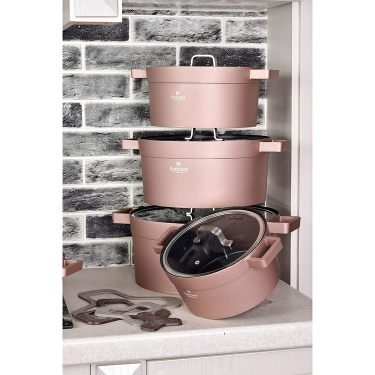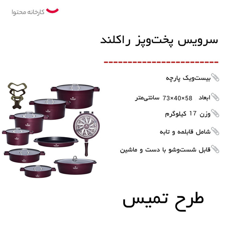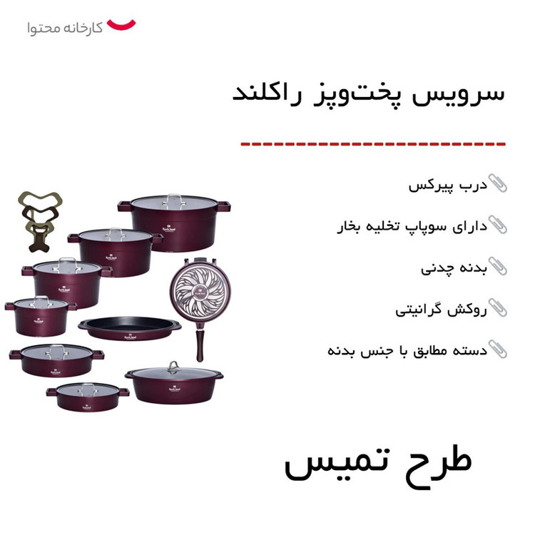 سرویس قابلمه راکلندمقاوم در برابر حرارت می باشد پوشش داخلی قابلمه گرانیت فوق العاده با کیفیت می باشد سرویس 21 پارچه شامل: قابلمه سایز 20 همراه درب قابلمه سایز 24همراه درب قابلمه سایز 28همراه درب قابلمه سایز 32همراه درب تابه سایز 24همراه درب تابه سایز 28همراه درب تابه رژیمی گرد تابه مرغ همراه درب تابه ماهی زیر قابلمه ای