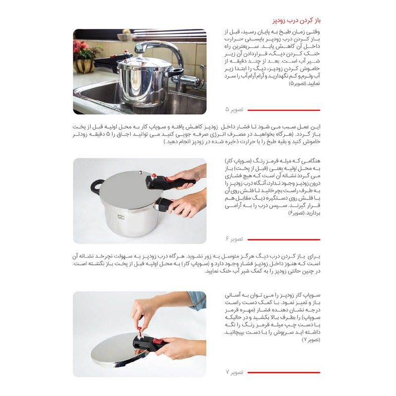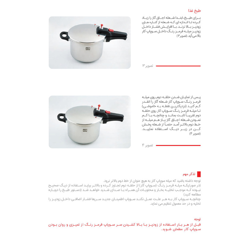سایر توضیحات : - استیل ضد خط و خش - کفه سه لایه آلومینیومی جهت جلوگیری از چسبندگی و سوختن غذا - سه سیستم تخلیه فشار جهت تامین حداکثر ایمنی - دارای ضامن روی دسته جهت باز و بسته نمودن درب - دارای نشان روی درب بمنظور آسان باز و بسته نمودن درب - قابل شستشو در ماشین ظرفشویی