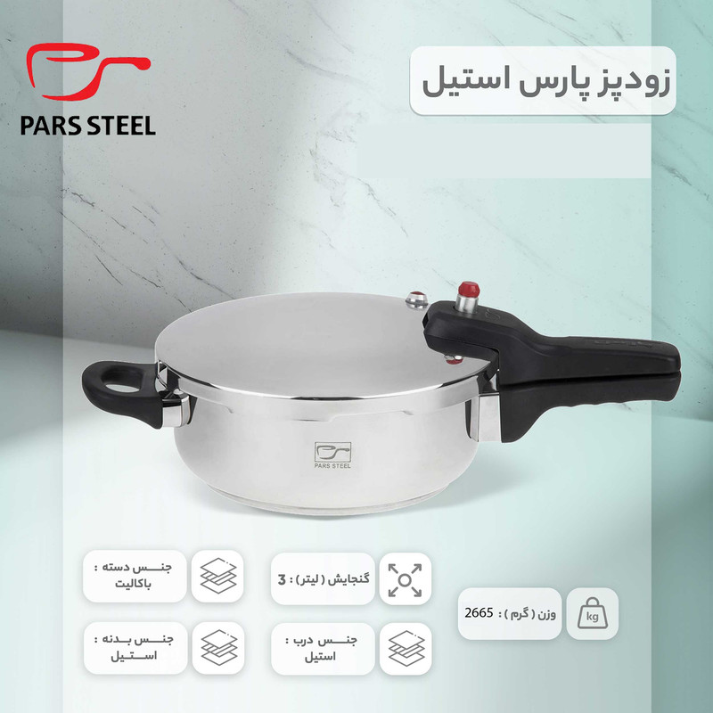 برای پخت یک خورش دو نفرهی فوری و خوشمزه، بهترین راه استفاده از زودپز سه لیتری «پارس استیل» (Pars Steele) است. این زودپز با بدنهی استیل، ضد زنگ و ضد خش است. با استفاده از آن میتوان برای دو تا چهار نفر خورش تهیه کرد. بدنهی مقاوم و ضد زنگ این زودپز، امکان استفادهی طولانی مدت از آن را میدهد. از وجوه تمایز این محصول نسبت به انواع دیگر، میتوان به سه سیستم تخلیه فشار اشاره کرد که حداکثر ایمنی را فراهم میکند. این زودپز دارای کفه آلومنیومی دو جداره است که حرارت را به طور یکنواخت پخش میکند و از سوختن غذا نیز جلوگیری میکند. زودپز پارس استیل را برای شستوشو میتوان درون ماشین ظرشویی هم قرار داد. شرکت پارس استیل از اولین تولید کنندههای قابلمه و زودپز در داخل است که سالها با استفاده از تکنولوژیهای روز، محصولاتی با کیفیت عرضه کرده است. این شرکت توانسته تا با تولیدات عالی، در بازار جهانی به رقابت بپردازد. این شرکت از ابتدا رضایت مشتری و کیفیت را اولویت تولیدات خود قرار داده و تا به امروز مورد استقبال بوده است.