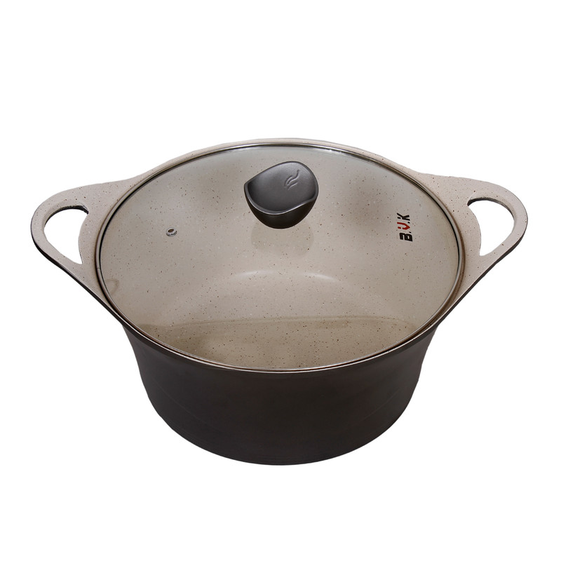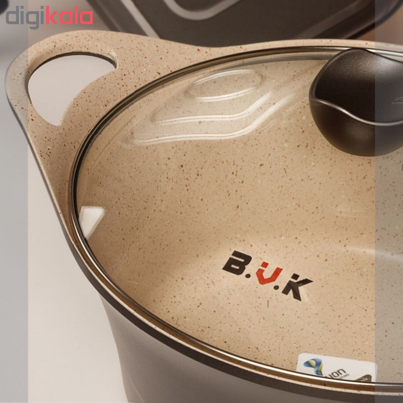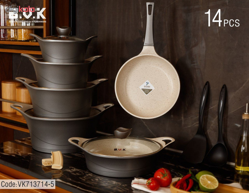 سرویس قابلمه 14 پارچه گرانیت برند B.V.k از سری محصولات به روز شرکت بی وی کی میباشد. این سرویس قابلمه با درب هایی از جنس پیرکس آنتی شوک بوده که اجازه مشاهده مراحل پخت را به شما میدهد و دارای محفظه خروج بخار است که از سر رفتن مایعات درون قابلمه جلوگیری میکند. دستگیره ظروف از جنس سیلیکون مقاوم که هماهنگی زیبایی را با بدنه به وجود اورده است تمامی ظروف از جنس گرانیت تهیه شده است گرانیت به عنوان روکش نچسب، دقیقا مثل تفلون است با این تفاوت که حاوی ترکیب مضر آزاد شده در هنگام خش به ظروف نیست. روکشهای گرانیتی در مقابل فرسایش و ساییدگی تا حد زیادی مقاوم هستند شستشوی آسان و انتقال سریع حرارت با مصرف انرژی کم و قابل استفاده بر روی انواع اجاق گازهای معمولی و القایی از دیگر ویژگی های سرویس قابلمهB.V.Kمیباشد. این ست زیبای پخت و پز از برند نام آشنای B.V.K میباشد.