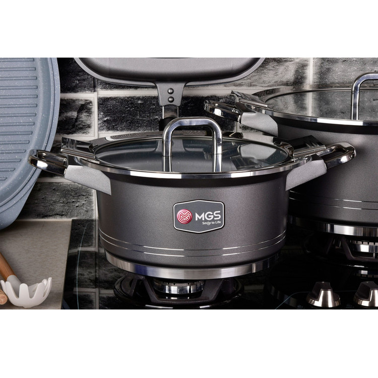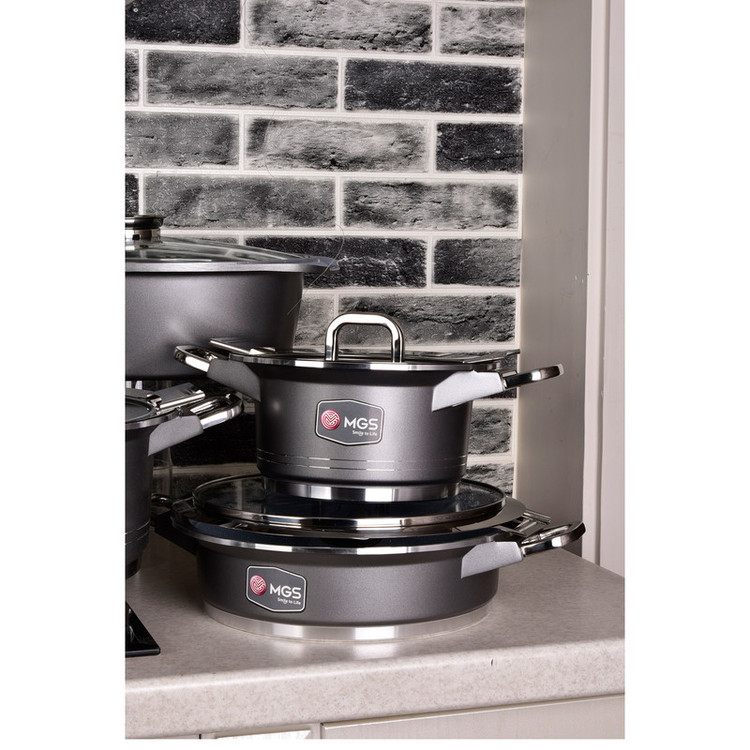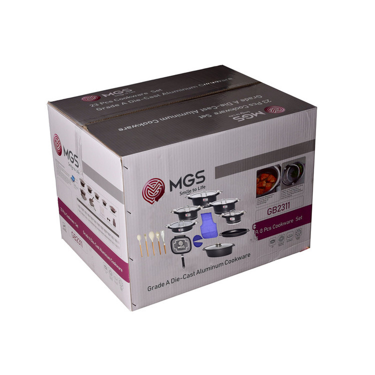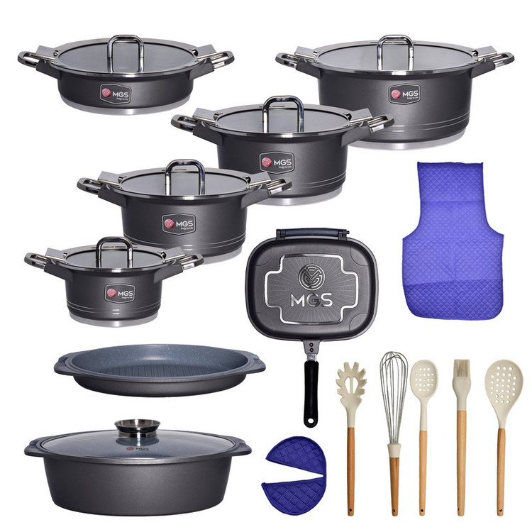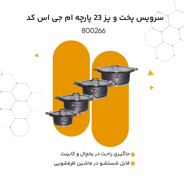 سرویس پخت و پز ام جی اس 23 پارچه از زیبایی و کیفیت بالایی برخوردار است وزیبایی به آشپزخانه شما میبخشد این سرویس شامل: قابلمه سایز 32 همراه درب قابلمه سایز 28 همراه درب قابلمه سایز 24 همراه درب قابلمه سایز 20 همراه درب تابه سایز 28 همراه درب تابه مرغ وماهی سایز 38 تابه رژیمی کفگیر ملاقه 5 تکه دو عدد دستگیره یک عدد پیشبند
