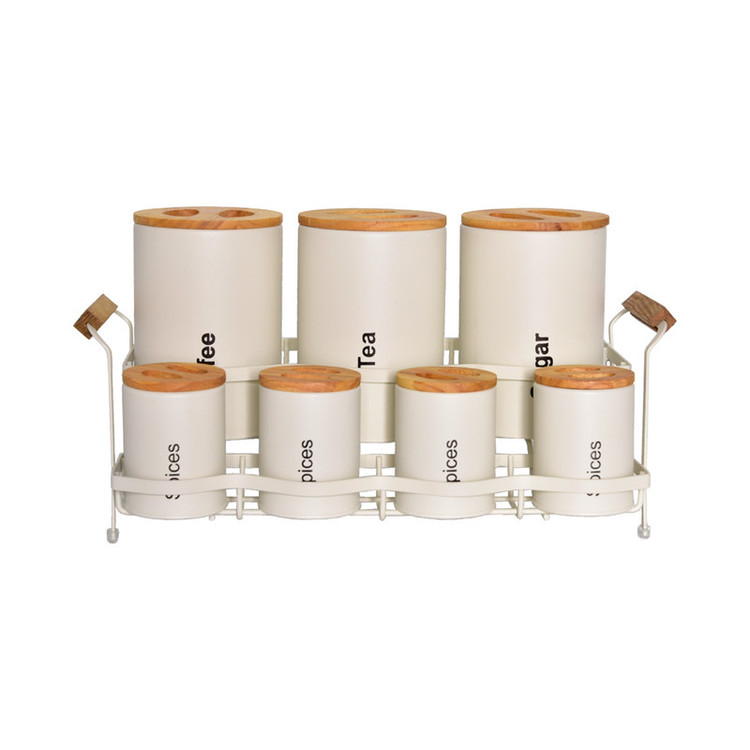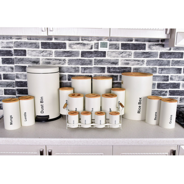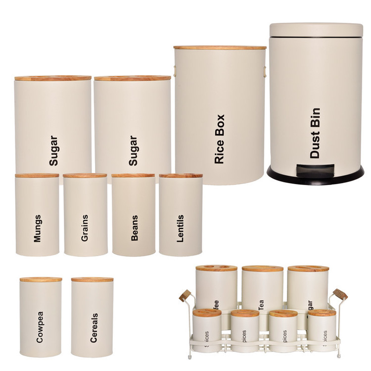 3 عدد پاسماوری، 4 عدد جای ادویه، 6 عدد ظرف حبوبات، 1 عدد سطل زباله، 1 عدد سطل برنج، 1 عدد جای قند، 1 عدد جای شکر.1 عدد استند
