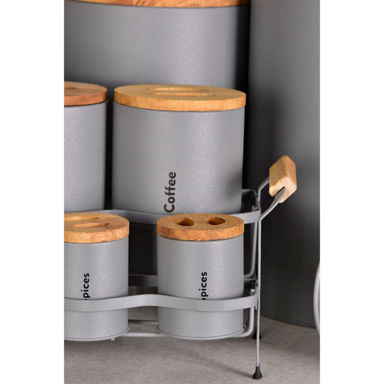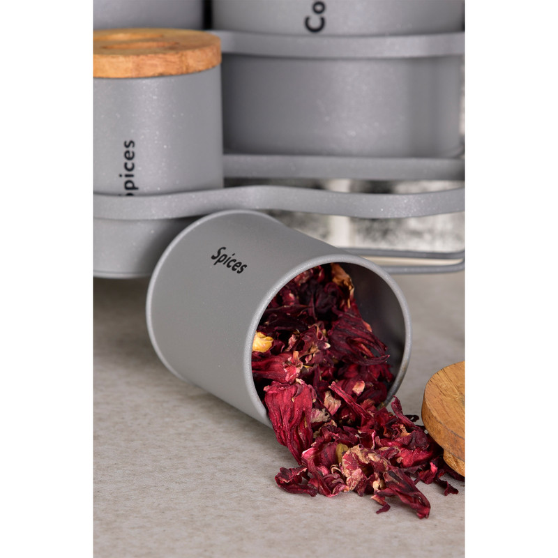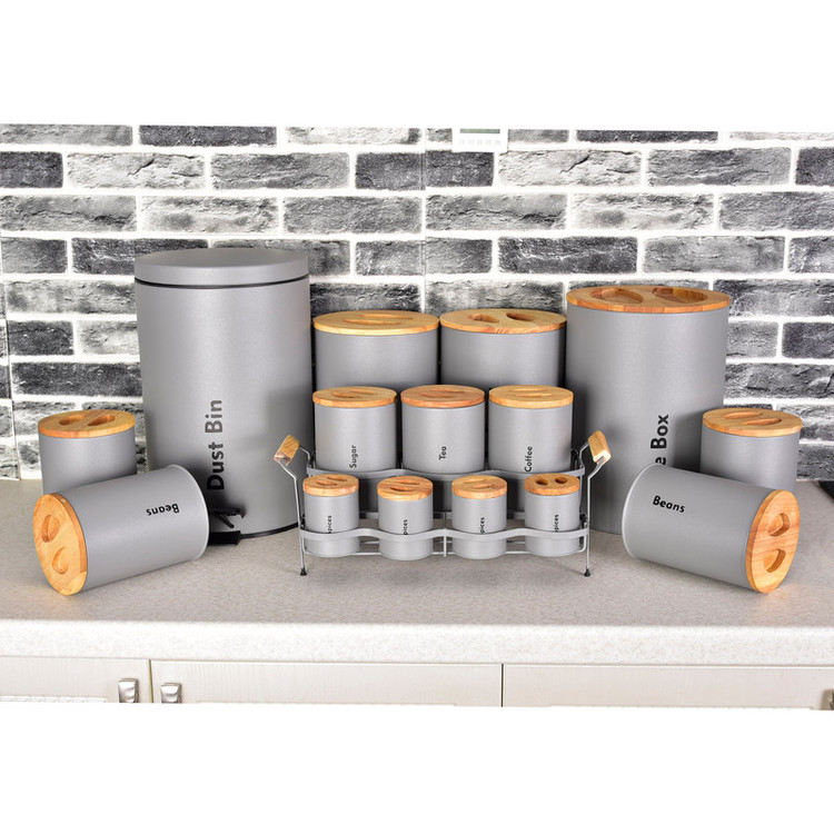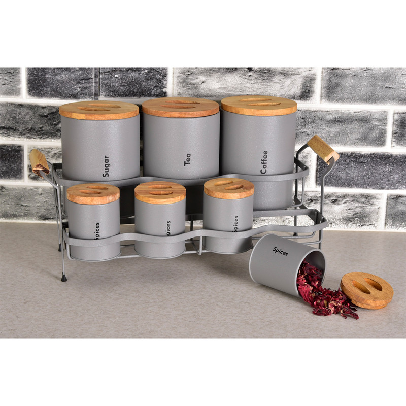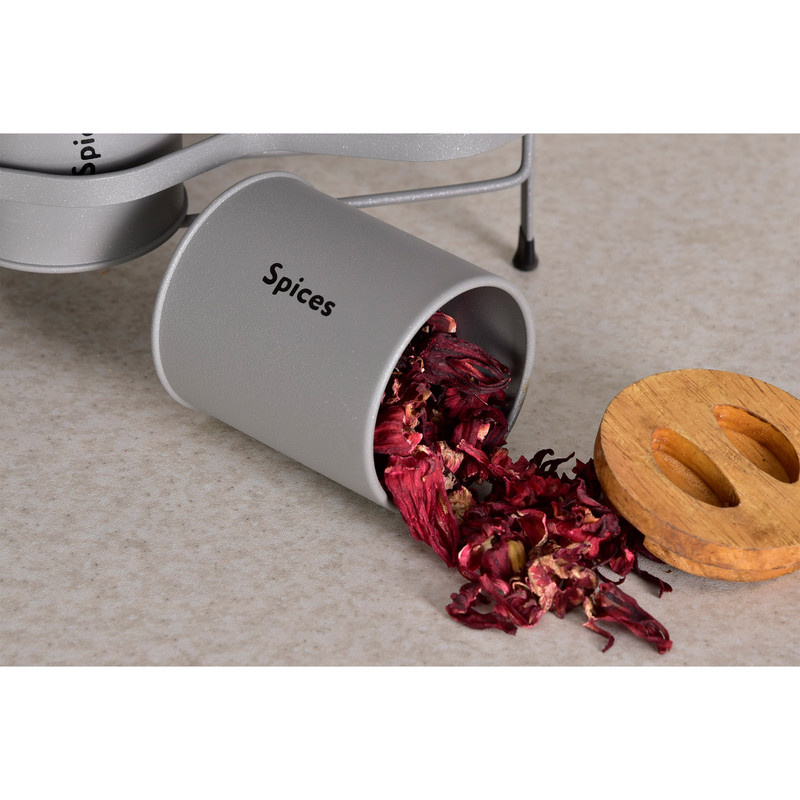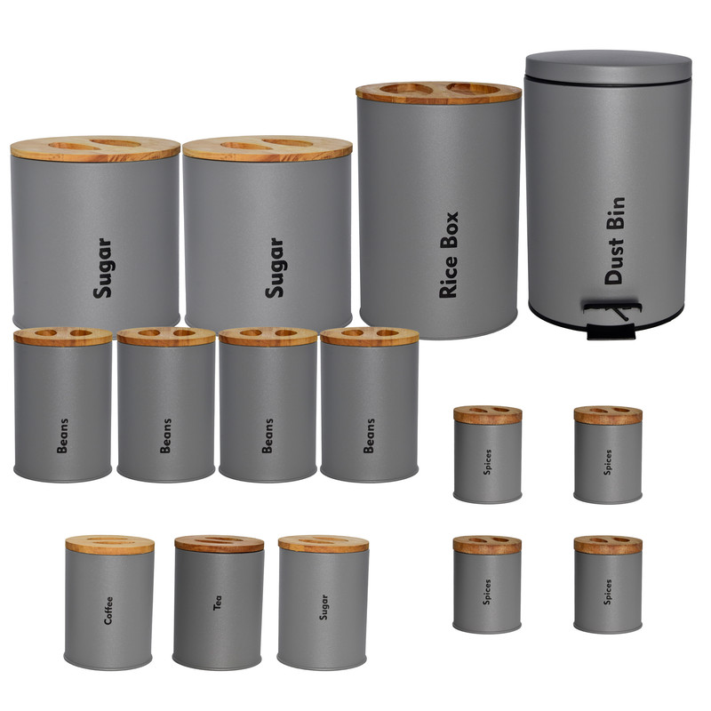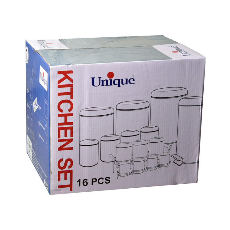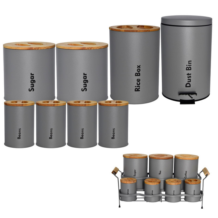 3 عدد پاسماوری، 4 عدد جای ادویه، 4 عدد ظرف حبوبات، 1 عدد سطل زباله، 1 عدد سطل برنج، 1 عدد جای قند، 1 عدد جای شکر.1 عدد استند